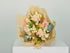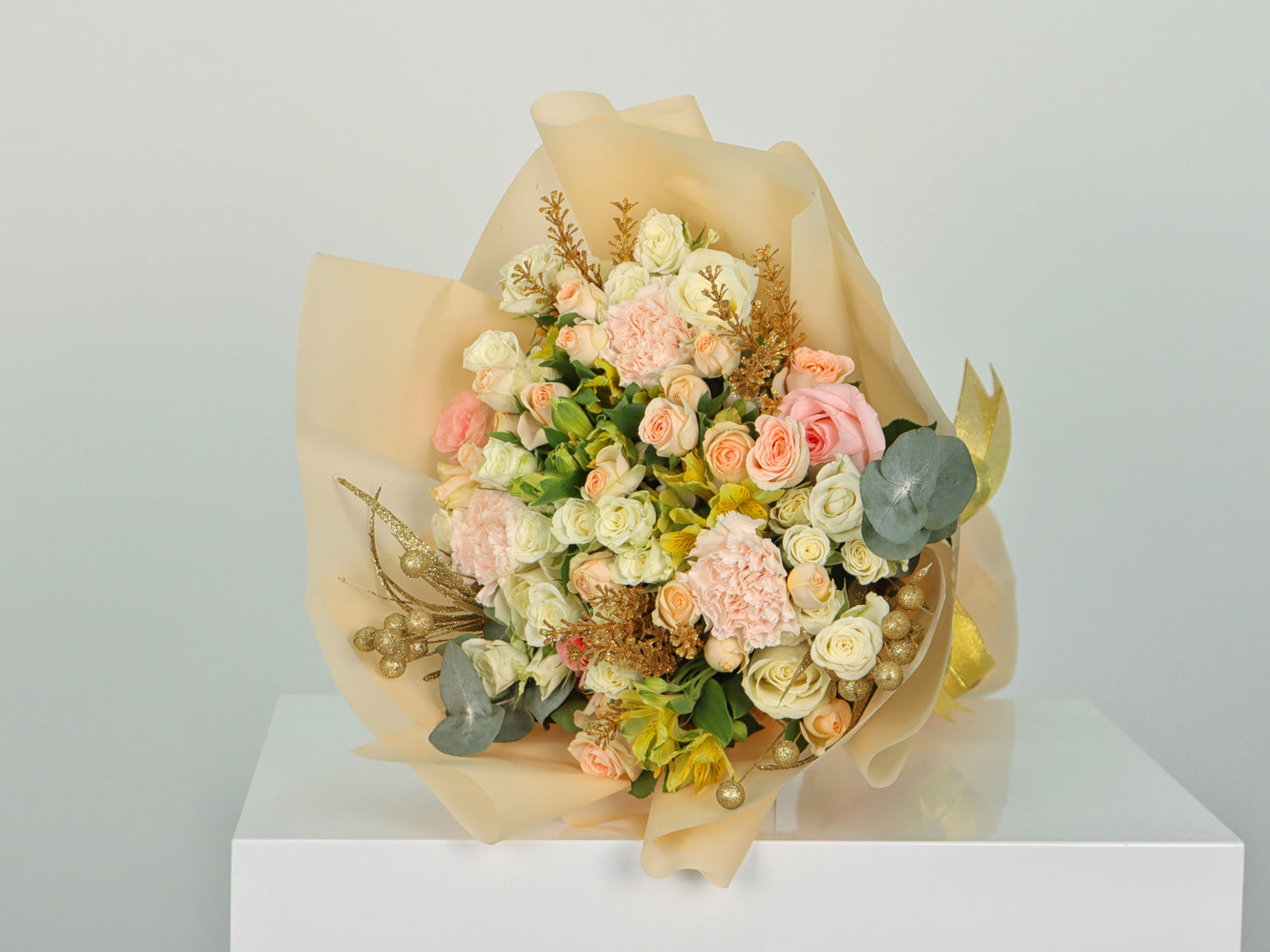 Mixed bouquet 10 : roses and baby roses in white, light pink, dark and peach with the distinctive yellow Alstroemeria flower with the soft and vibrant carnation flower with fragrant Eucalyptus with a brown wrapper and golden ribbon in a beautiful and wonderful arrangement.