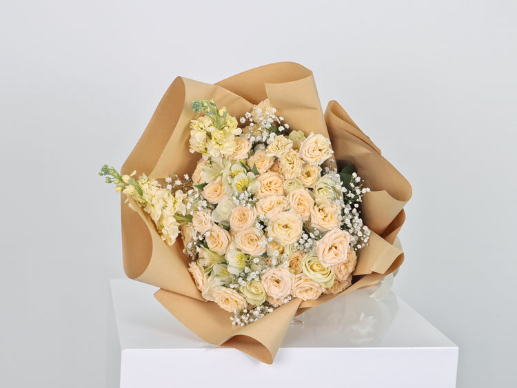 A mixed bouquet 12 : roses and baby roses in vibrant peach and white colors with the soft Alstroemeria flower and the distinctive Matthiola flower with gypsophila with a brown paper cover and a rope to tie in a beautiful and wonderful arrangement.