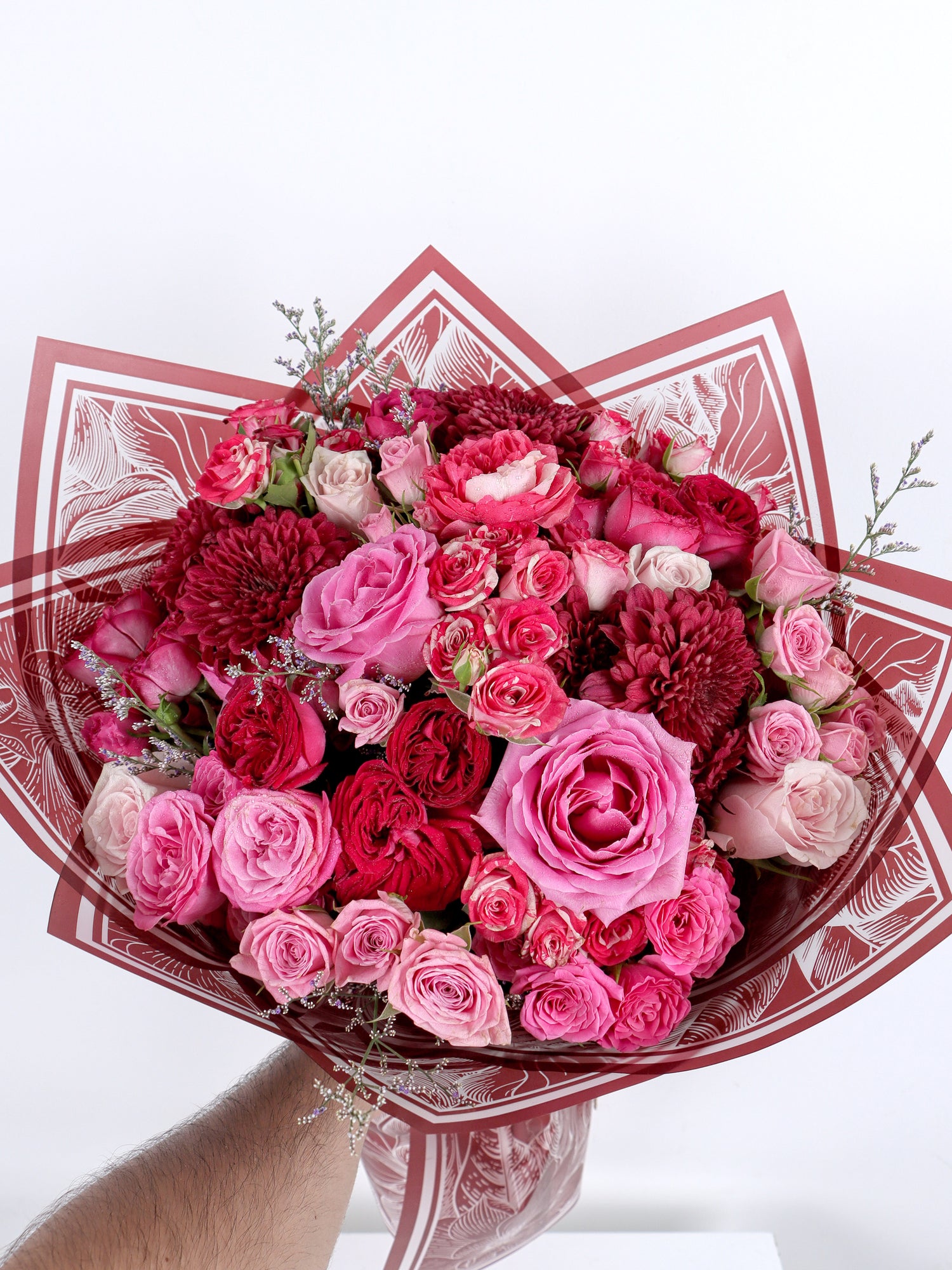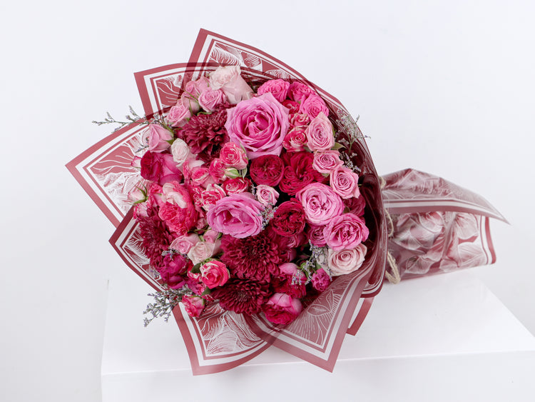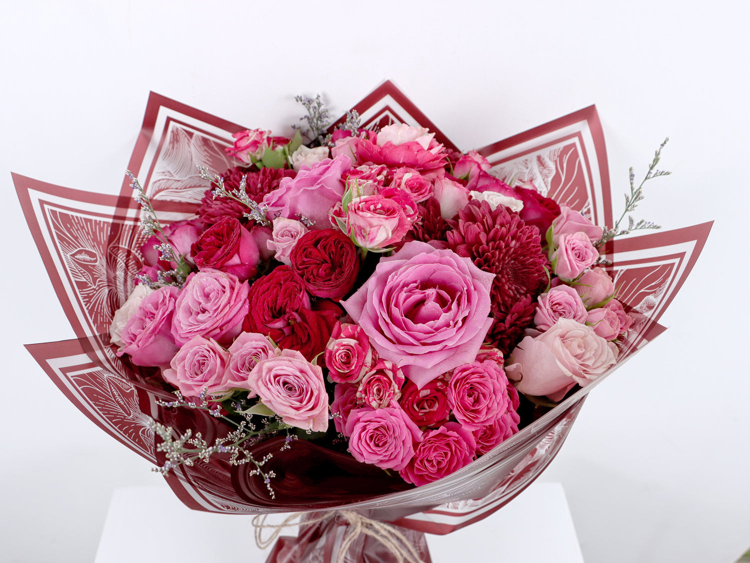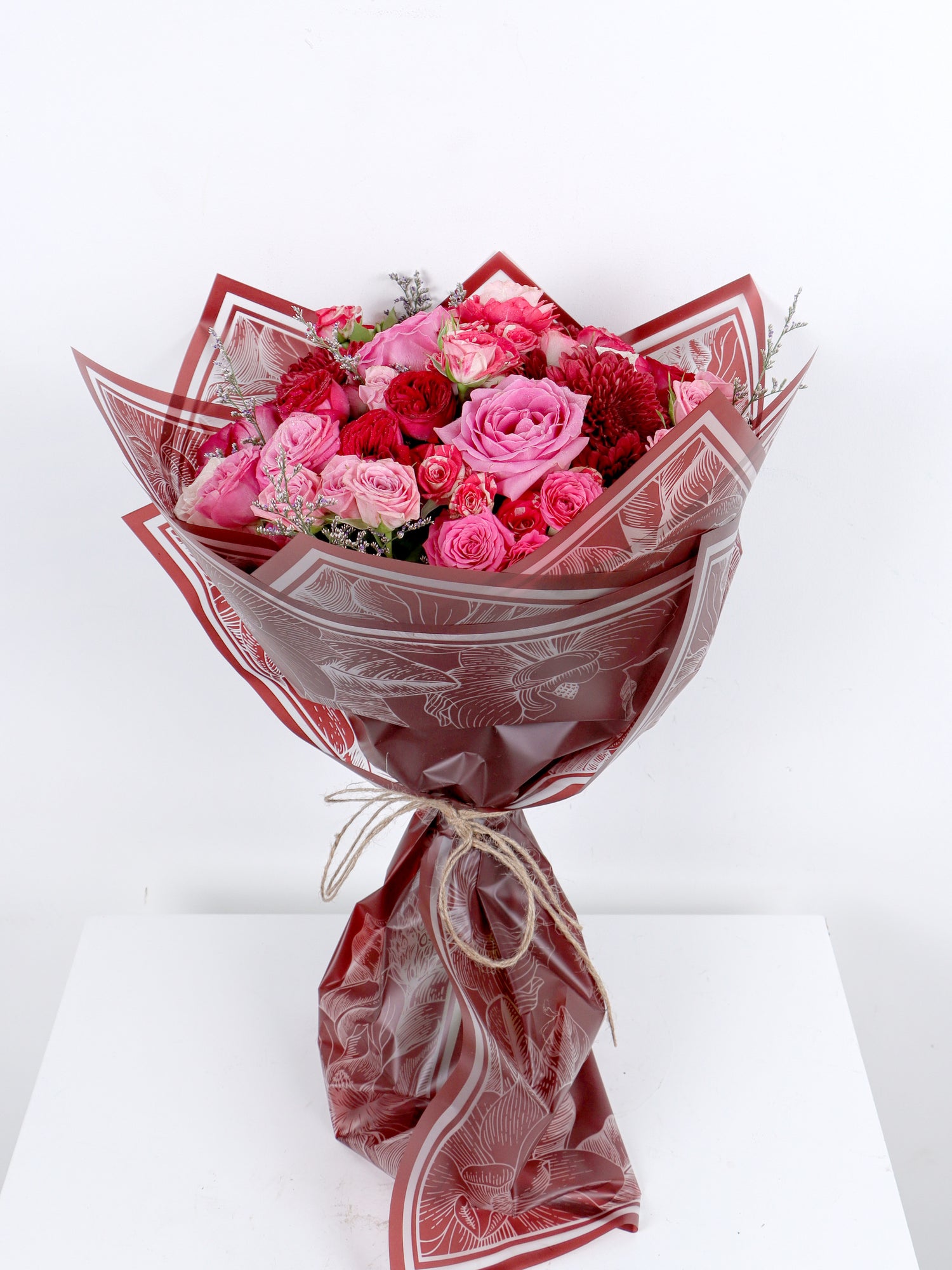 Mixed bouquet of 2 of roses and baby roses in light and dark pink and purple with a distinctive chrysanthemum flower in purple with liminum and a burgundy colored cover with a rope to tie in a beautiful and wonderful arrangement.