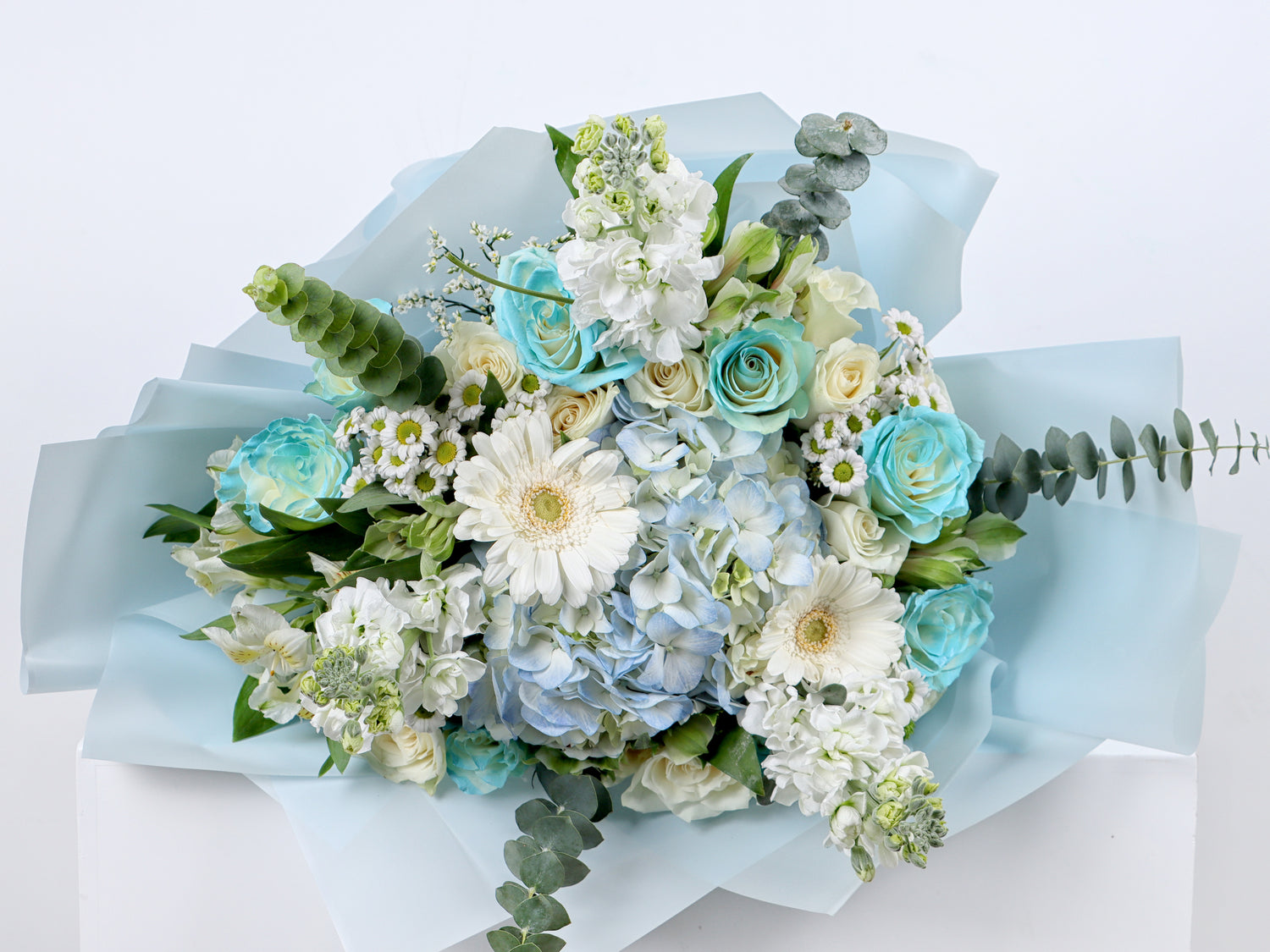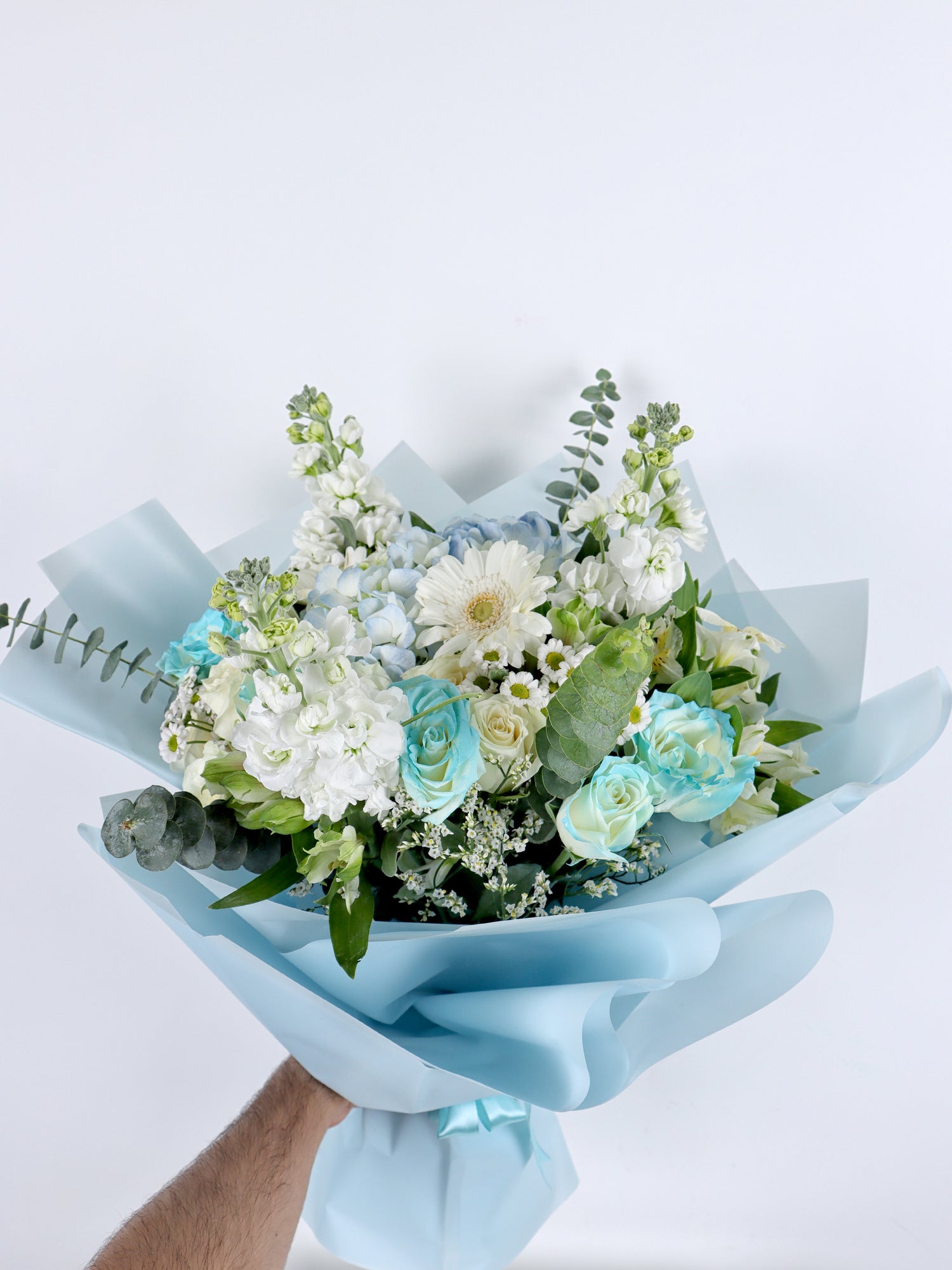 Mixed bouquet 20 : roses and baby roses in white and blue with a Hydrangea flower in the middle of the bouquet with a Santini flower and a soft Matthiola flower with a distinctive Alstroemeria flower with Limonium and a fragrant Eucalyptus with a blue wrapper and a rope to tie it in a beautiful and wonderful arrangement.