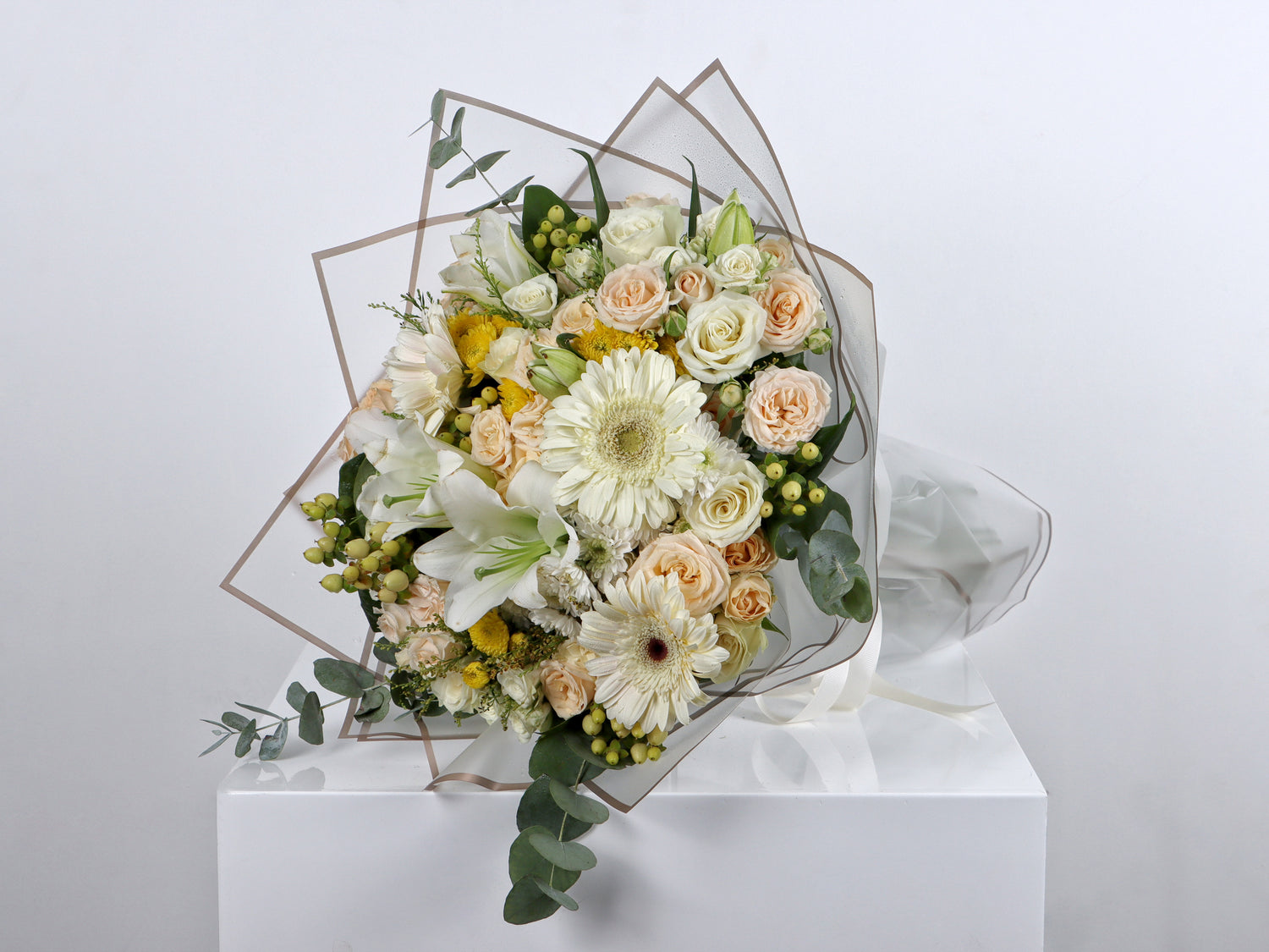 Mixed bouquet 22 : roses and baby roses in white and peach with the distinctive Gerbera flower and the Santini flower in the braid color with the distinctive Lily flower in addition to the Hypericum flower and the fragrant Eucalyptus flower with a white wrapper and white ribbon in a beautiful and wonderful arrangement.
