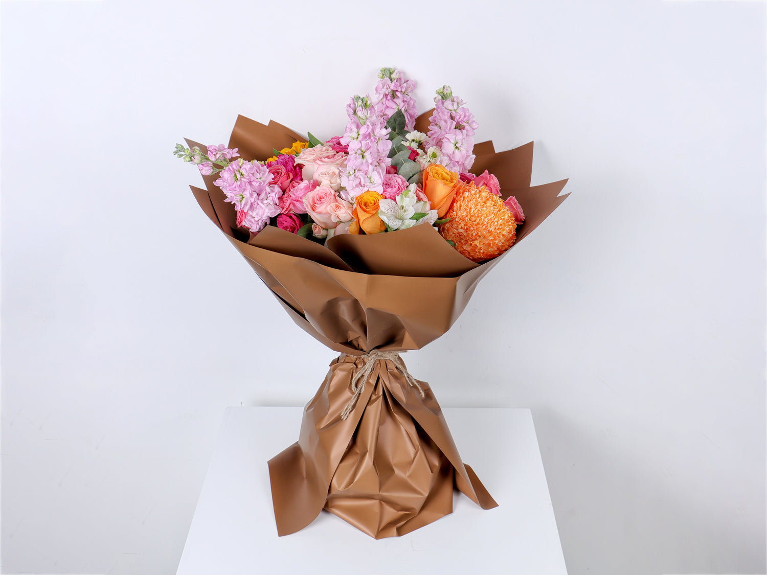 Mixed bouquet of 3 roses and baby roses in light and dark pink, purple and orange with a soft Matthiola flower and a vibrant sunflower with a Santini flower in various colors with a brown wrapper and a rope to tie in a beautiful and wonderful arrangement.