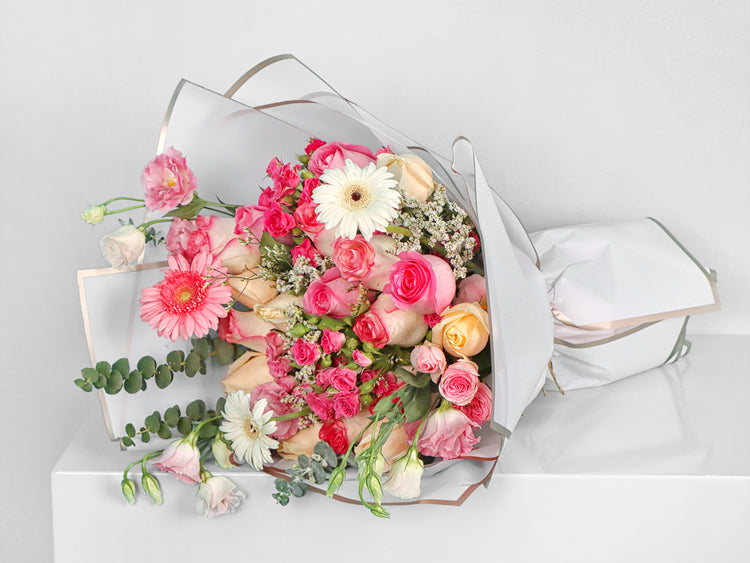 Mixed bouquet 43 : of roses and baby roses in light, dark pink and peach with the distinctive vibrant Gerbera flower and the soft Astoma flower in addition to the Solidago with a white cover and a rope to tie in a beautiful, distinctive and very wonderful arrangement.