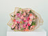 Mixed bouquet of 6 of roses and baby roses in light, dark pink and peach with the distinctive Matthiola flower and the special vibrant Santini flower with liminum and rascus with a light brown cover and a rope to tie in a beautiful and wonderful arrangement.