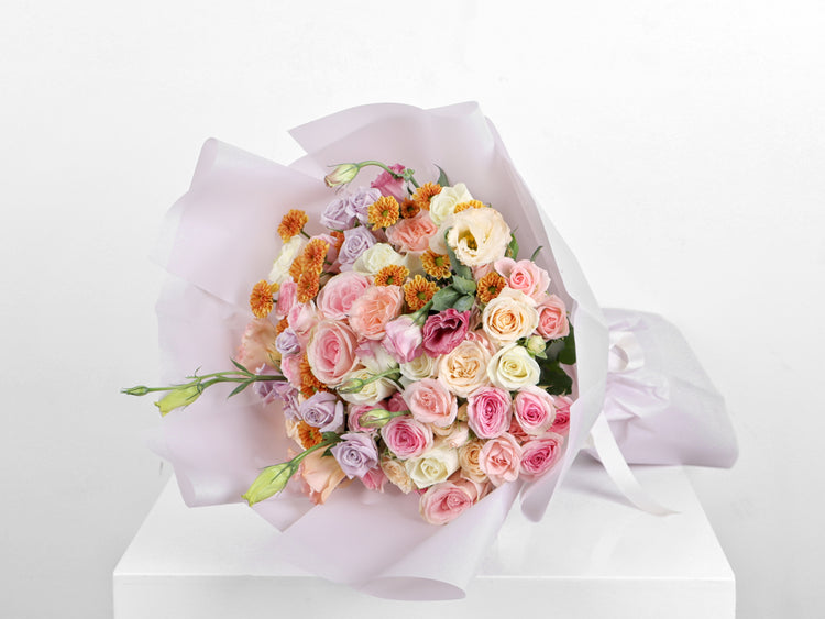 Mixed bouquet of 7 of roses and baby roses in light and dark pink, peach, white and deep purple with the distinctive Astoma flower and the special vibrant Santini flower with a light pink wrapper and white ribbon in a beautiful and wonderful arrangement.