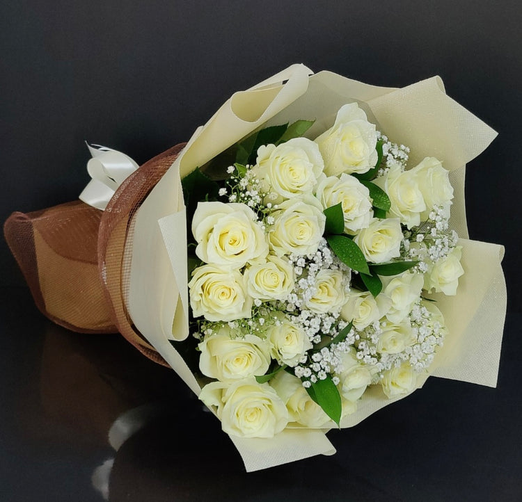This is a beautiful arrangement to bring peace and joy. 24 pcs of white roses, white wrapping .