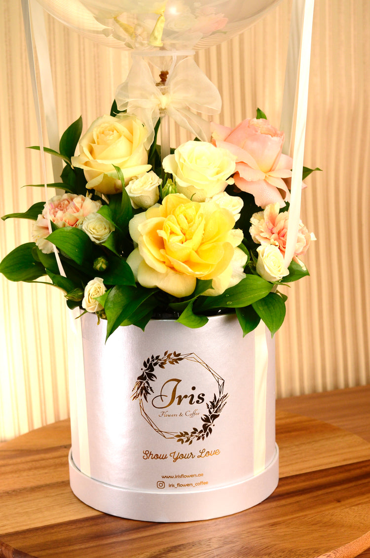 Yellow and Orange flowers with balloon in box