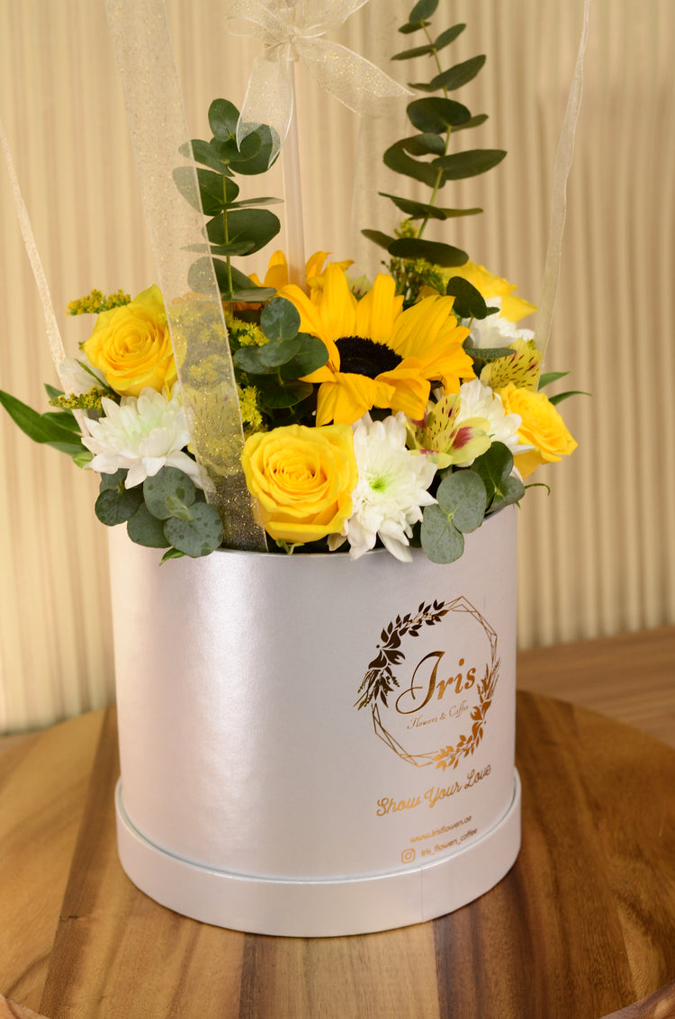 Yellow flowers with balloon in box