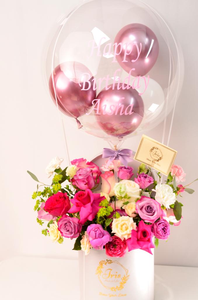Pink flowers box with balloons